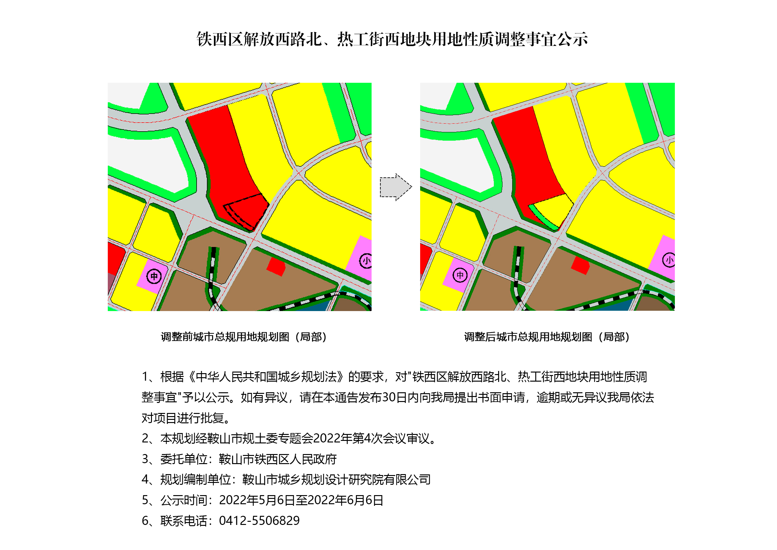 1、根据《中华人民共和国城乡规划法》的要求,对"铁西区解放西路北、热工街西地块用地性质调整事宜"予以公示。如有异议,请在本通告发布30日内向我局提出书面申请,逾期或无异议我局依法对项目进行批复。