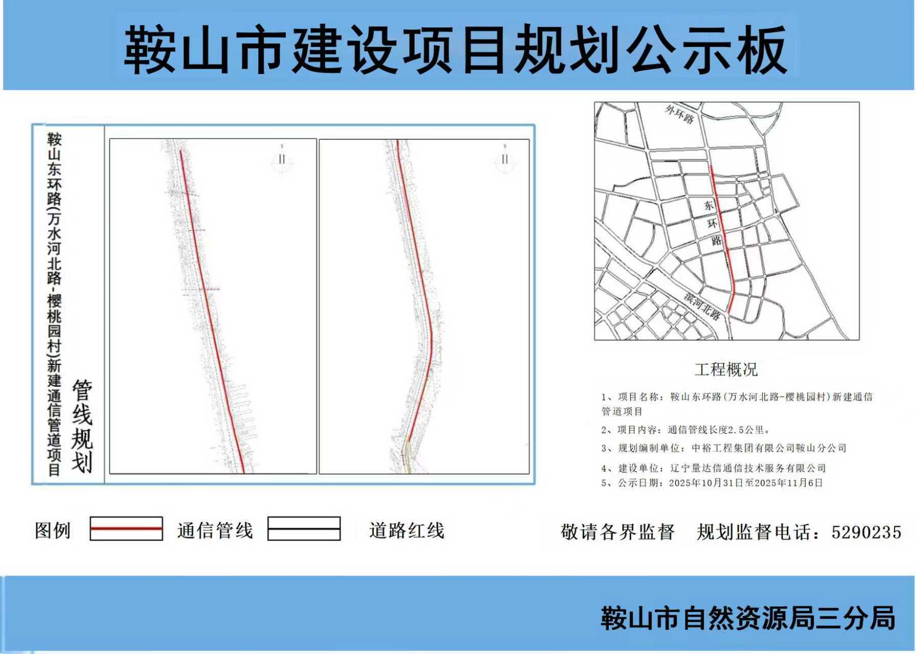 1、根据《中华人民共和国城乡规划法》的要求,对”鞍山东环路(万水河北路-樱桃园村)新建通信管道项目“予以公示。