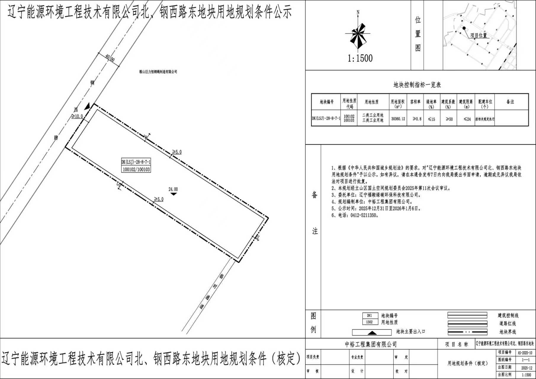 1、根据《中华人民共和国城乡规划法》的要求,对"辽宁能源环境工程技术有限公司北、钢西路东地块用地规划条件"予以公示。